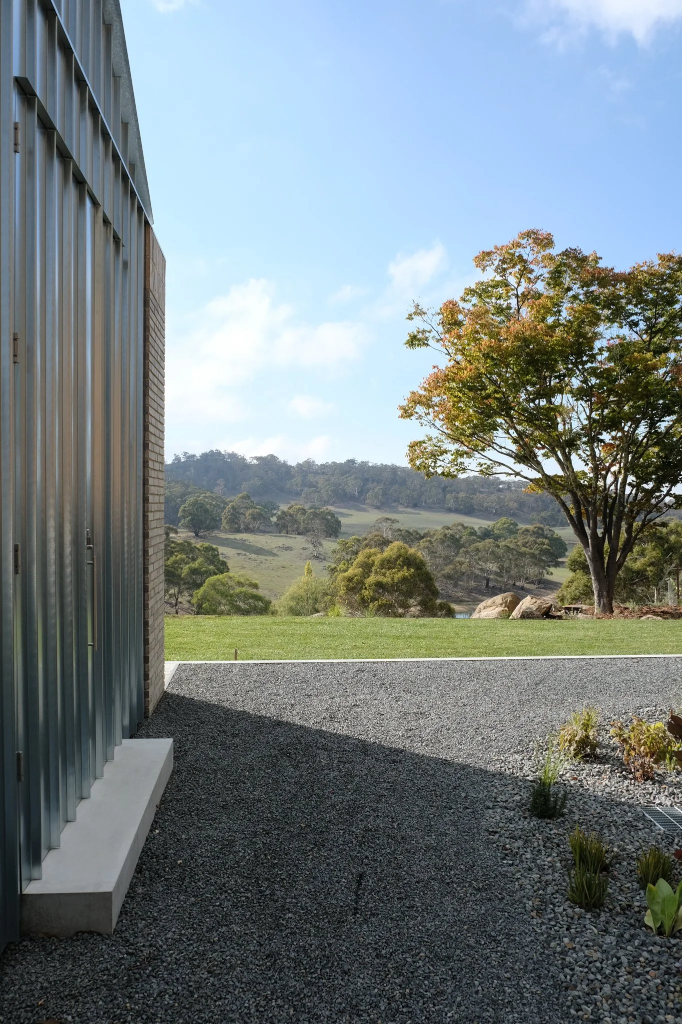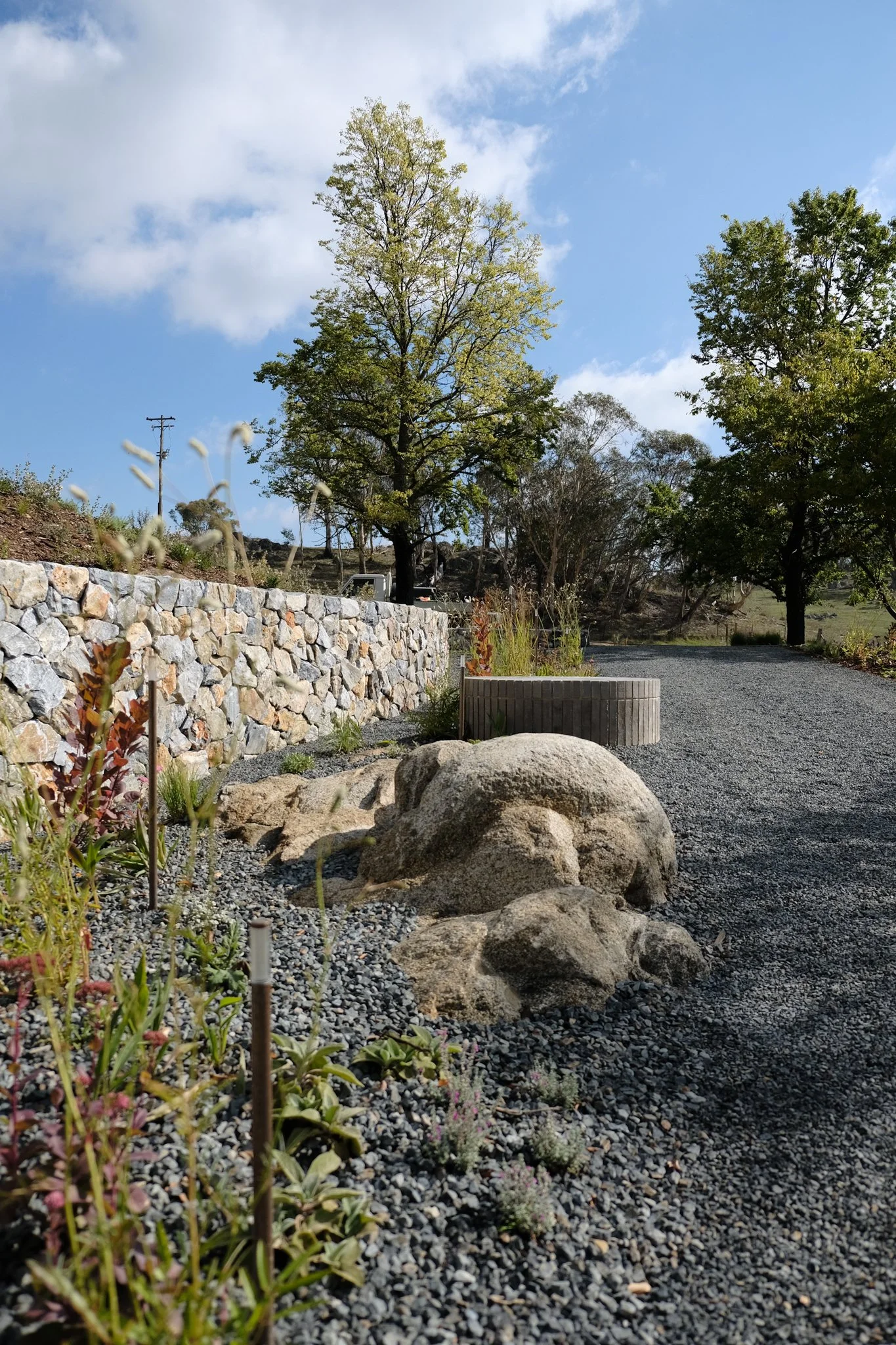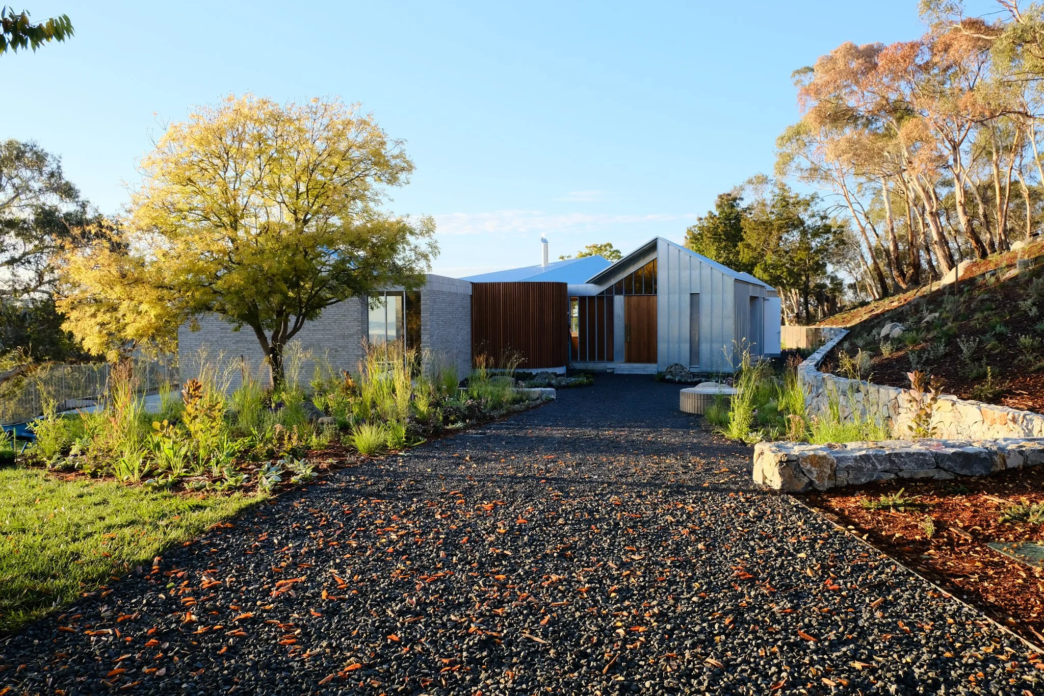 Around the house, broad swathes of gravel and rock outcrop do the hard work: letting the building breathe, keeping fuel loads low, supporting effective fire suppression.