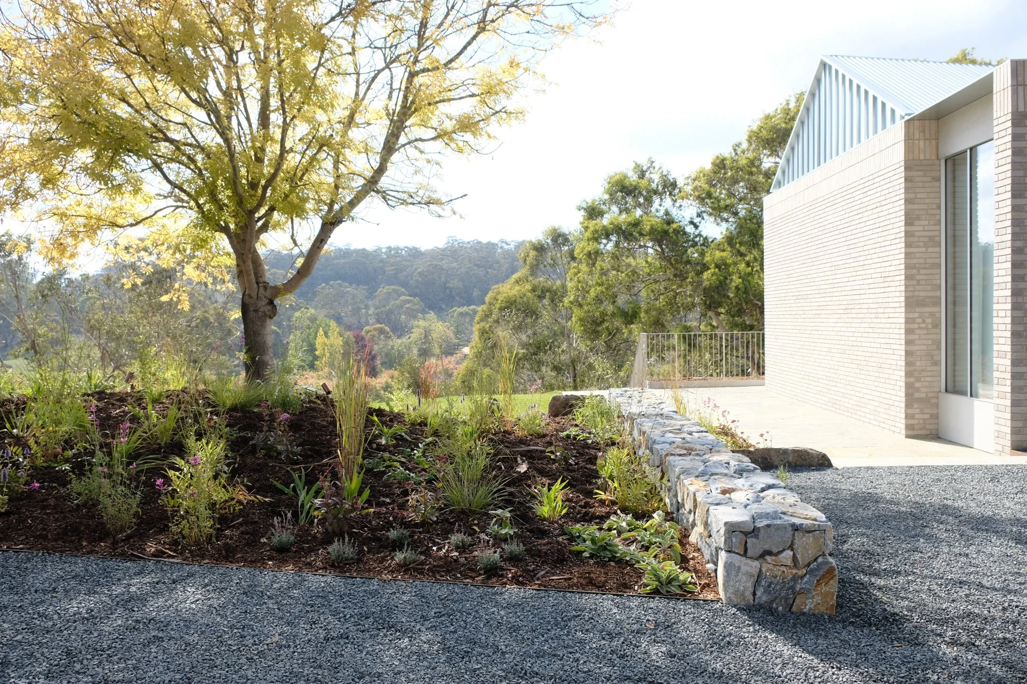 Excavate deep enough to nestle the ground floor into the slope, then regrade 2,000m³ of soil back across the site. Hunt for flatness on a 1:2 grade; carve out pockets of level lawn where life can sprawl. Revegetate the slope with a hardy, locally tuned palette. A garden that belongs to its surrounds, not one that fights them. Thread in pickable flowers. Casual bouquets. Morning missions. finally, design with bushfire resilience in mind.